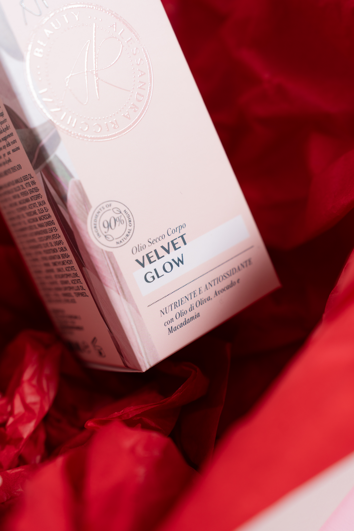 Completa il tuo rituale di bellezza con VELVET GLOW, olio corpo nutriente e antiossidante con Olio di Oliva, Avocado e Macadamia, combinati con preziosi olii vegetali di Mirtillo rosso e Chia, ricchi di acidi grassi come l’Omega 3, e con ingredienti estratti dal Ginseng e Aloe.